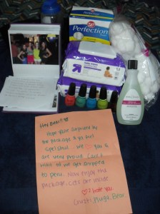 This package saved my life! I asked my mom to send me some of my clothes from back home because Olmos is way too hot for the wardrobe I had during training. Now I have shorts, tank tops and light tees galore!! Plus, when everything in your life is brand new, wearing your old clothes makes you feel like yourself again.